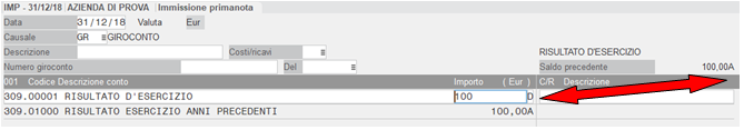 - dopodiché andiamo in Contabilità/Immissione contabile ed effettuiamo un giroconto come nell’esempio qua sotto indicando come importo quello risultante dal saldo precedente del conto stesso: